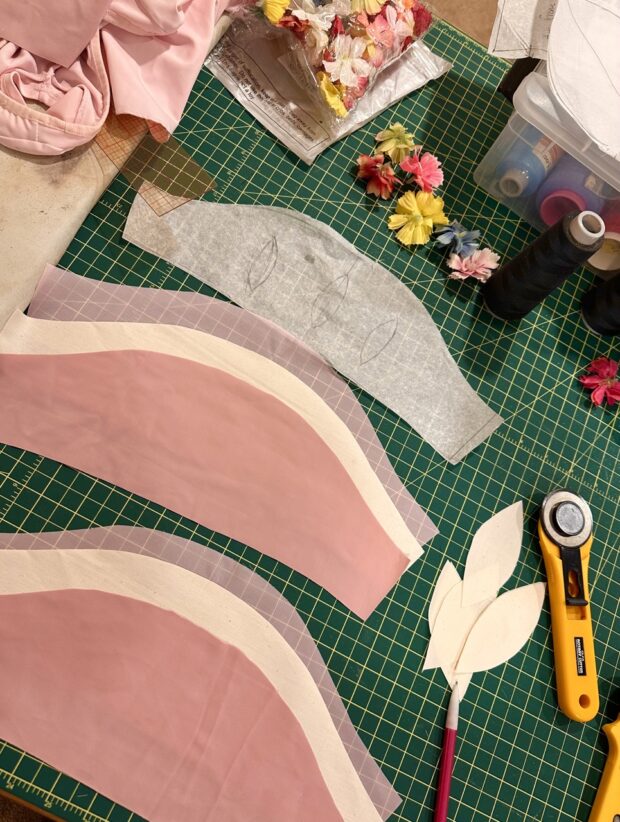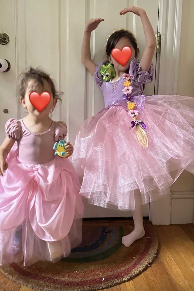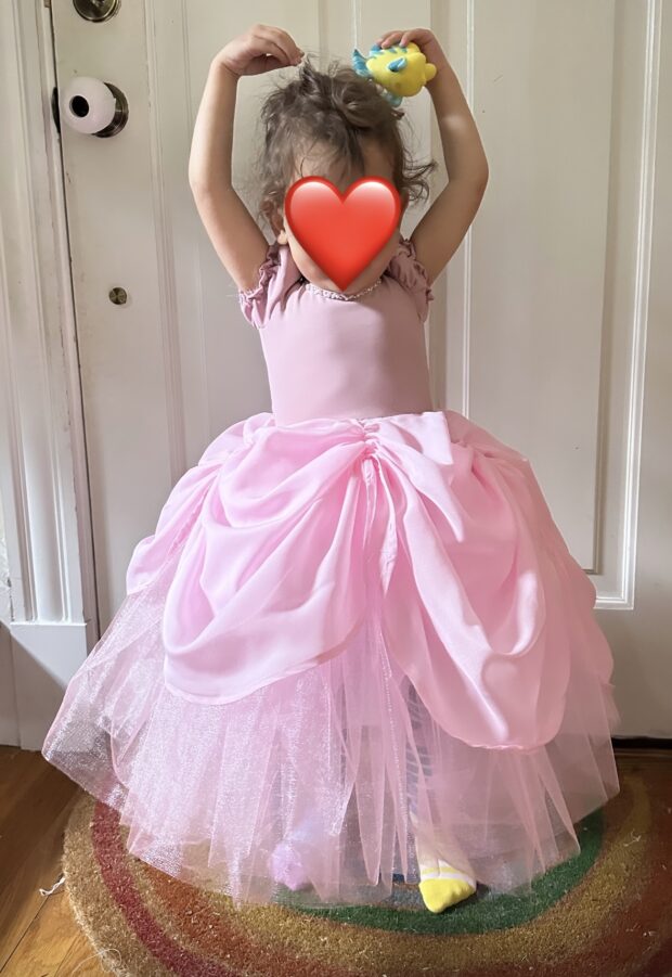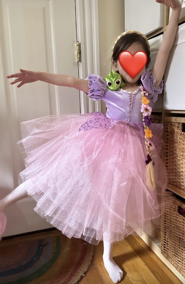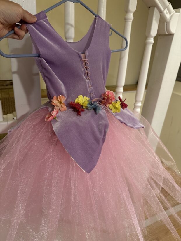 Rapunzel was pretty straightforward. She has 5 layers of gathered tulle on the skirt bit, and then I decided to experiment with a bit of a tutu plate situation on top. And then I’d ordered a bunch of fake flowers for the wig so I decided to just throw a couple on the dress for extra oomph. And then a mom friend gave me a bunch of retired Disney branded costumes so I was able to harvest some official Rapunzel glitter tulle for even more oomph. I really liked the flowers on the skirt but they were vetoed.