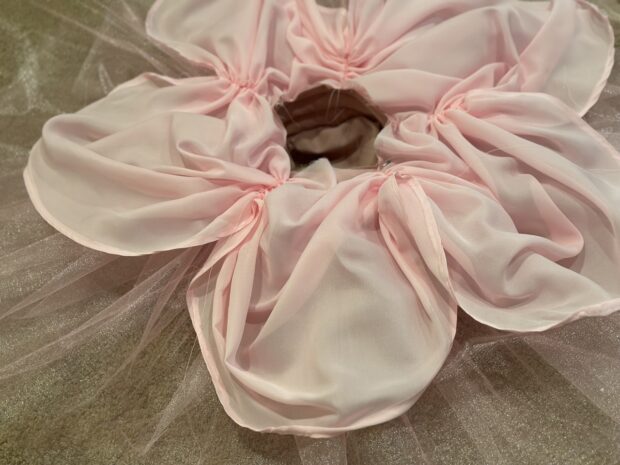I could only fit 3 rows of tulle on this tiny bum, and then I added a giant circle that I gathered up in 5 spots to make the skirt petals.