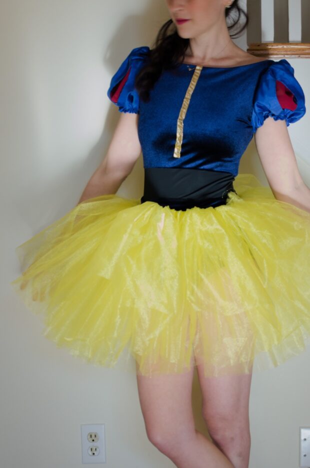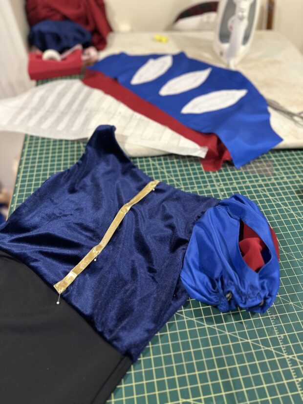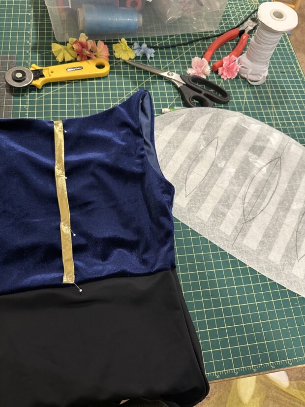 For Snow White, I decided to just make a leotard that I can actually wear and then make all the ish on it removable so I can actually use this thing after Halloween. I used my favorite high boat neck leotard pattern with navy velvet bodice and black contrast bottom bit. I’ll do a leotard post at some point but this one is an altered Jalie pattern.